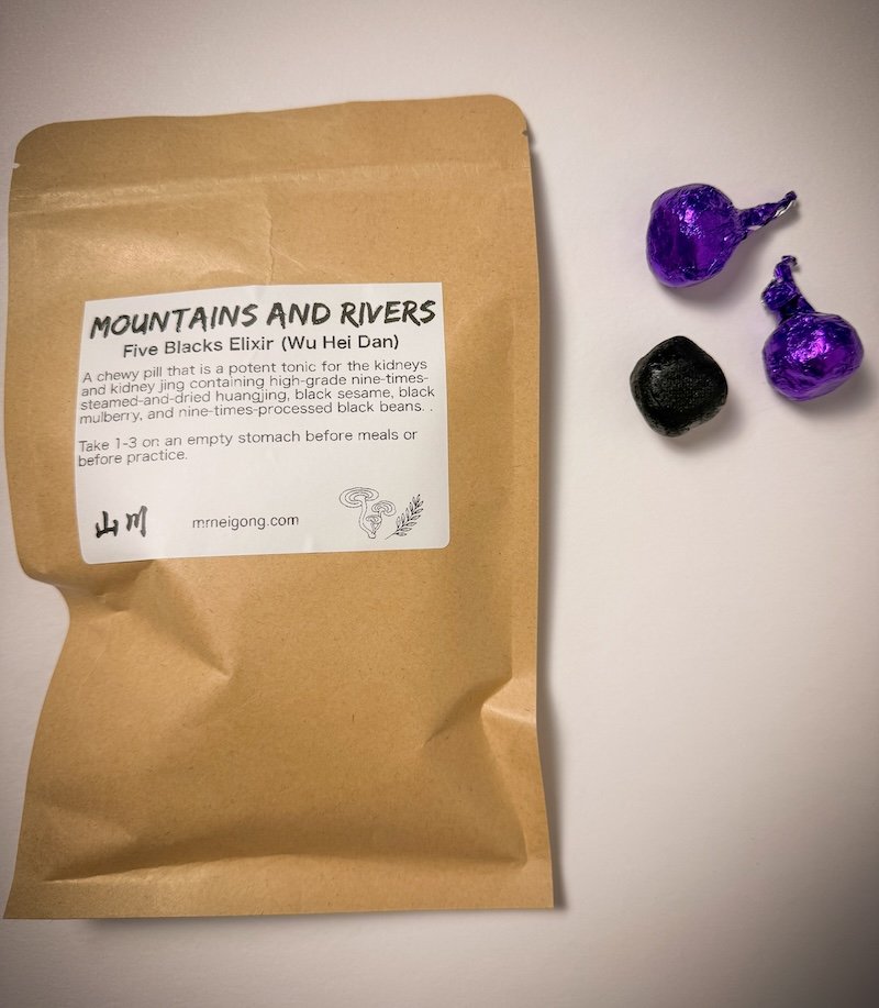 This chewy pill (actually a tasty snack) is a potent tonic for the kidneys and kidney jing. It contains the same high-grade nine-times-steamed-and-dried huangjing offered here, but combined with other kidney jing-boosting ingredients such as nine-times processed black sesame, black mulberry, and nine-times-processed black beans. These are specifically used for boosting vitality (as confirmed in men by the experience of morning erections) and can help to bring about the phenomena known in neidan circles as huo zi shi 活子时“living zi time.”